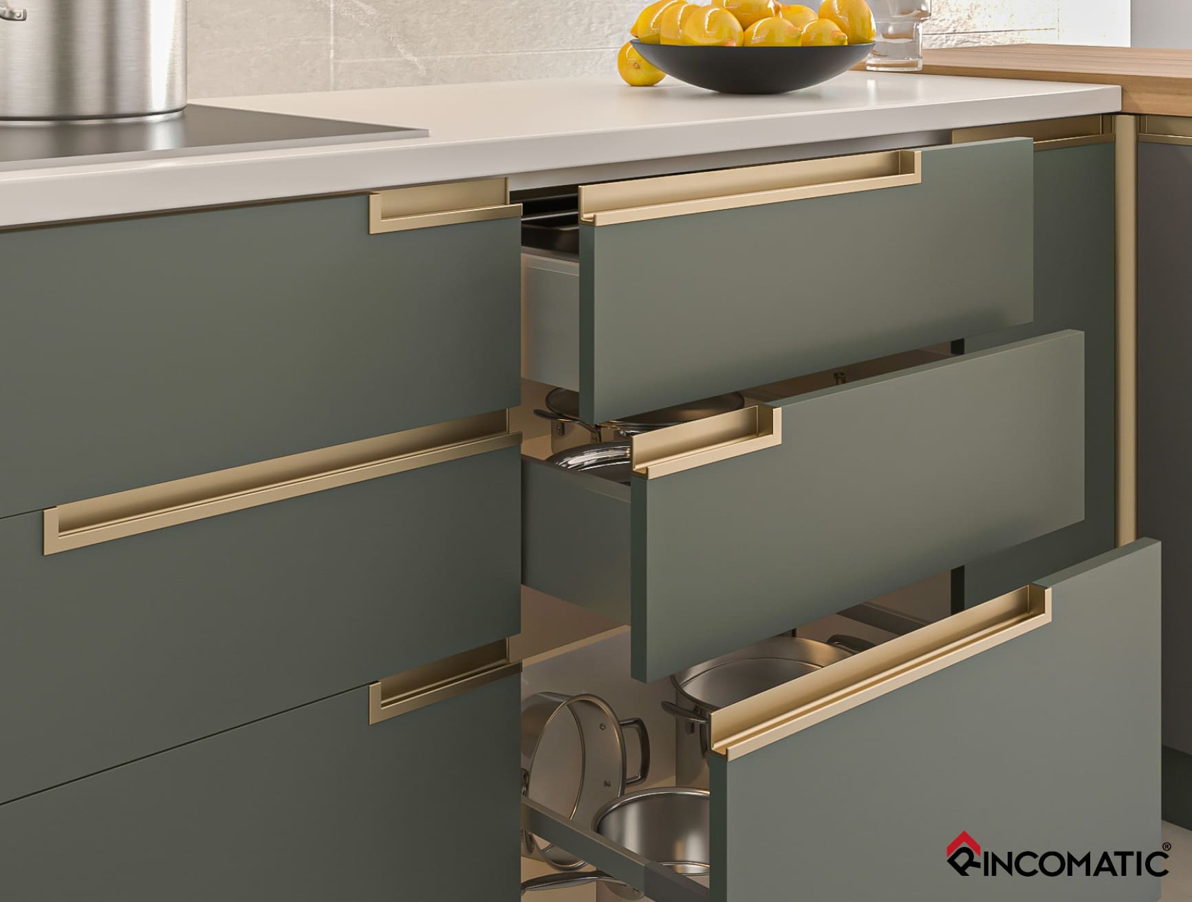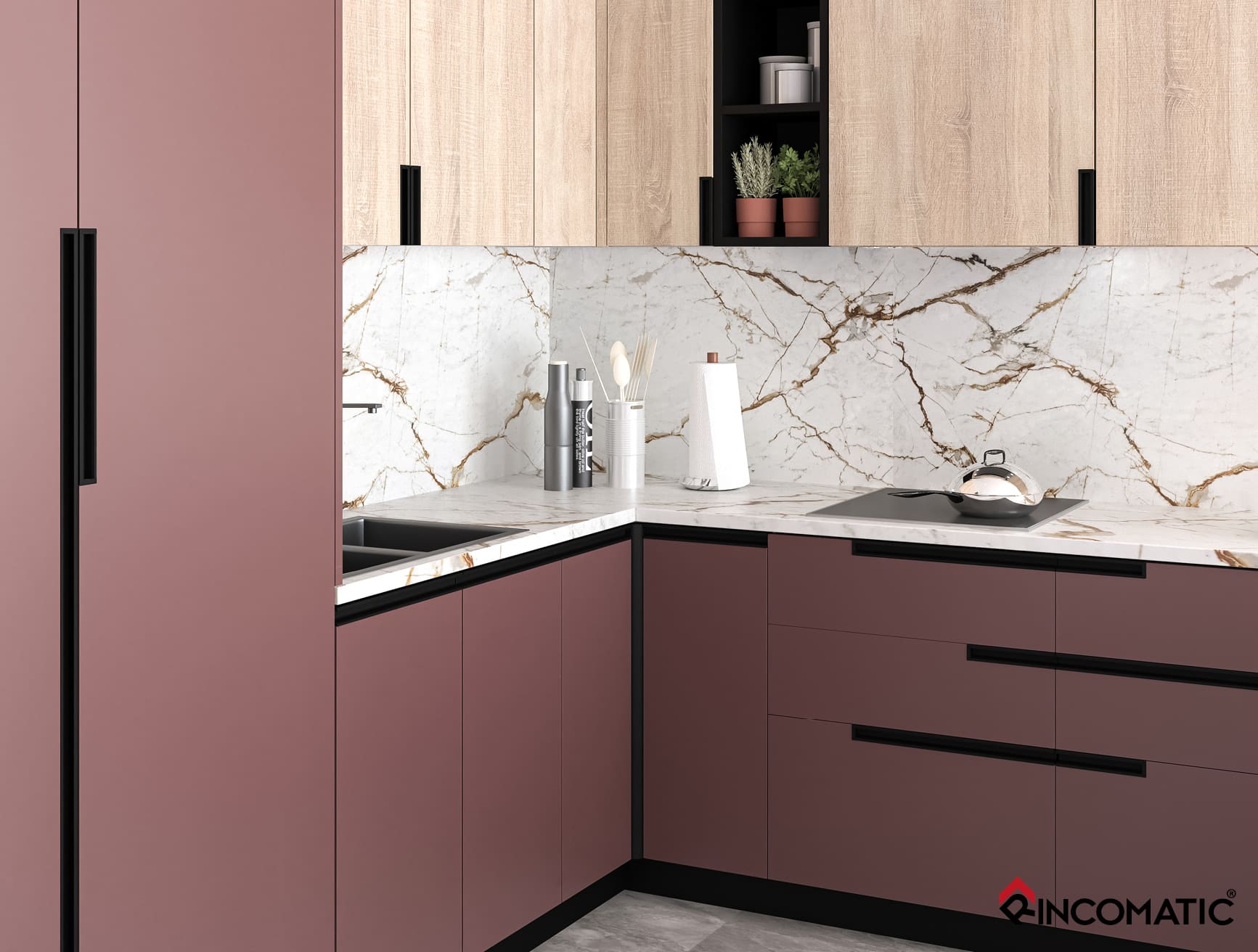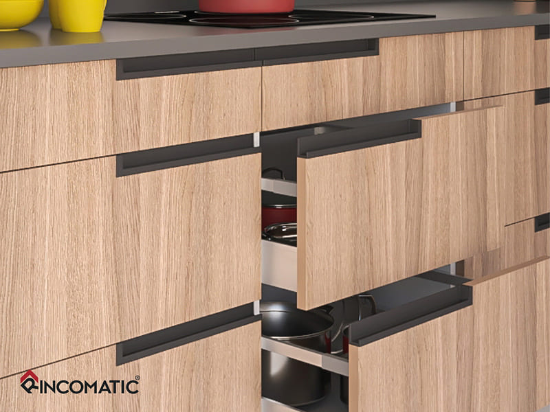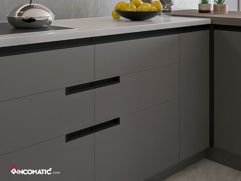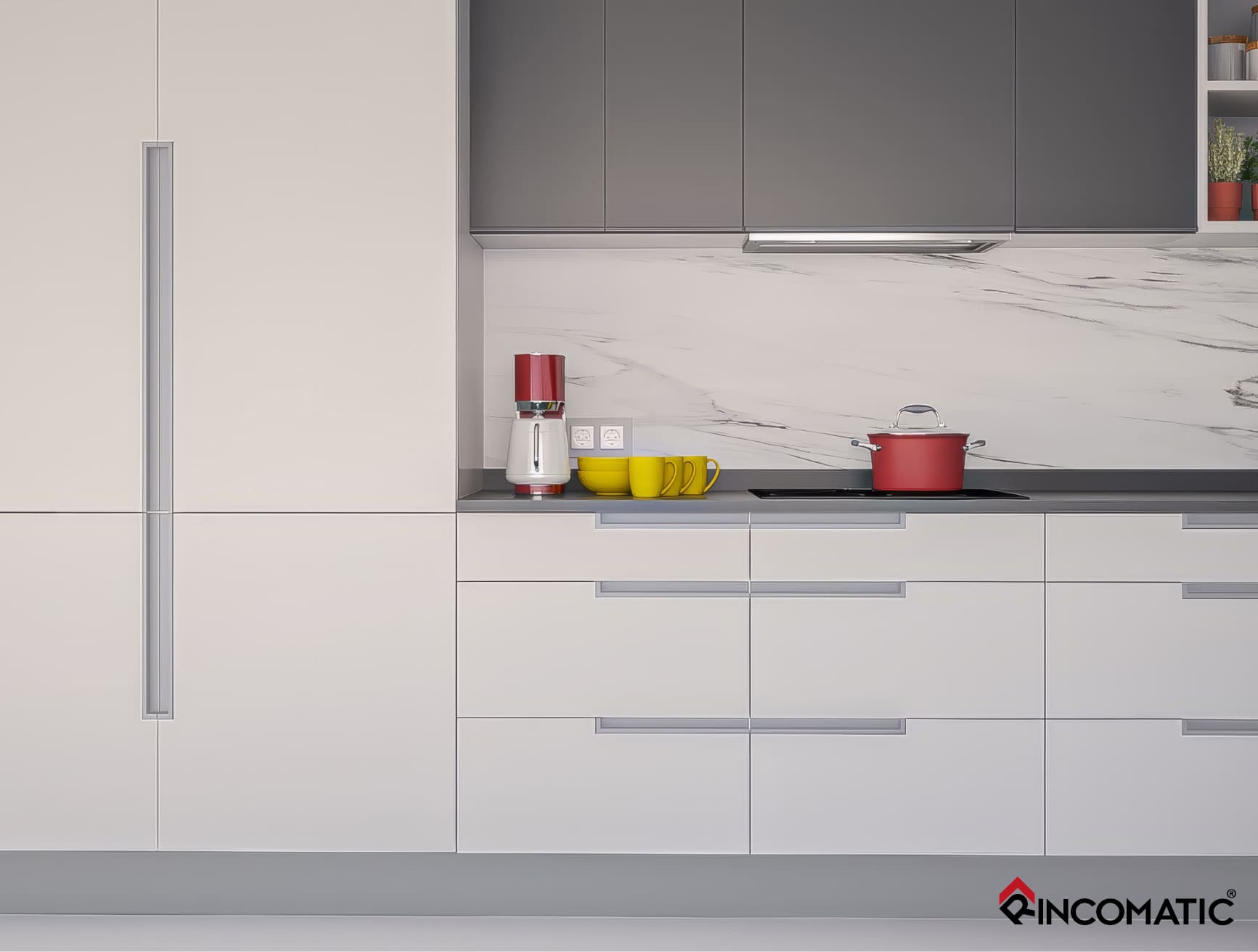 The combination of partially integrated left- and right-handed handles allows to achieve a variety of projects. Ideal for modern kitchens, commercial and residential applications, and more. Select the desired location and size. Can be used horizontally or vertically. Check bellow the most current colours.