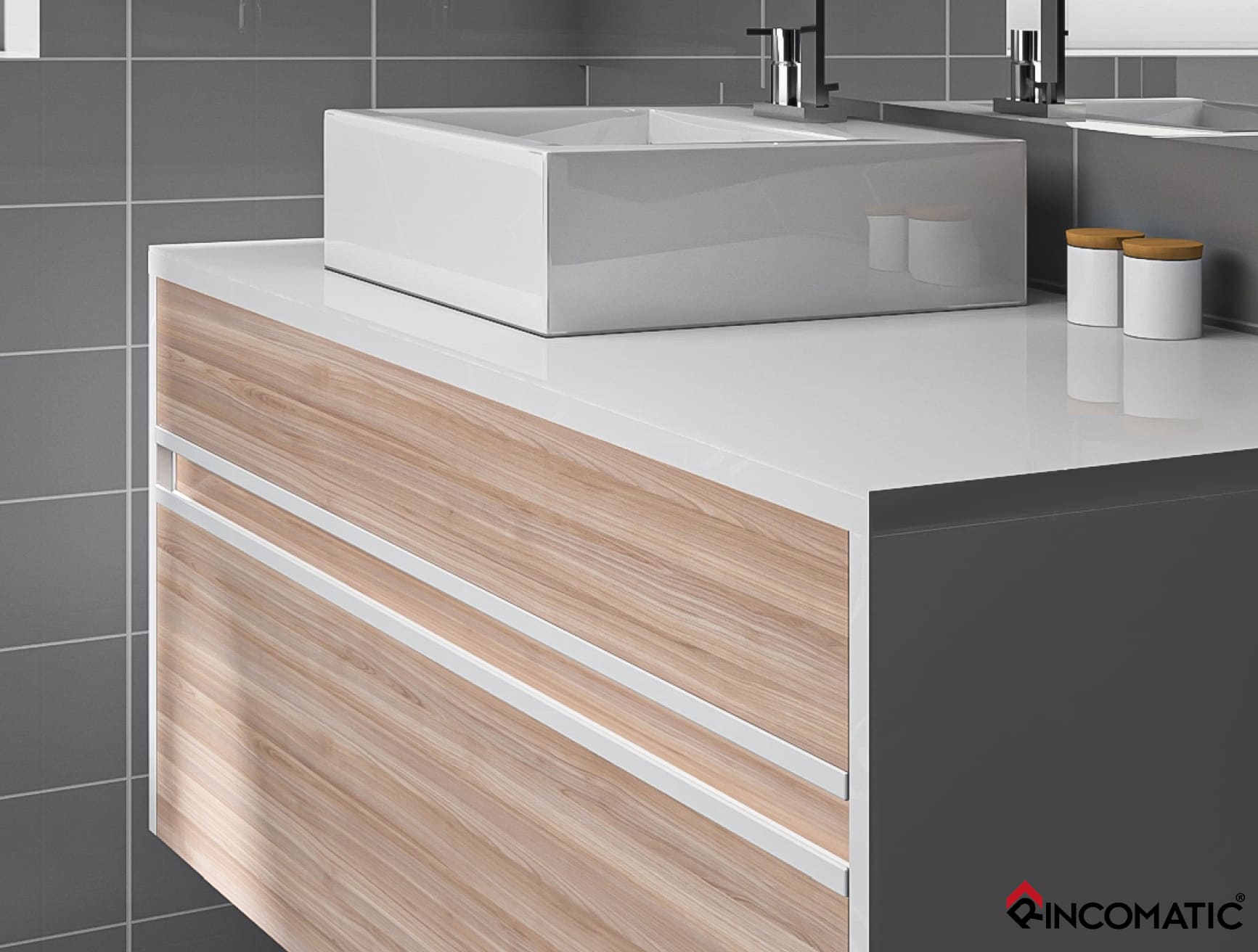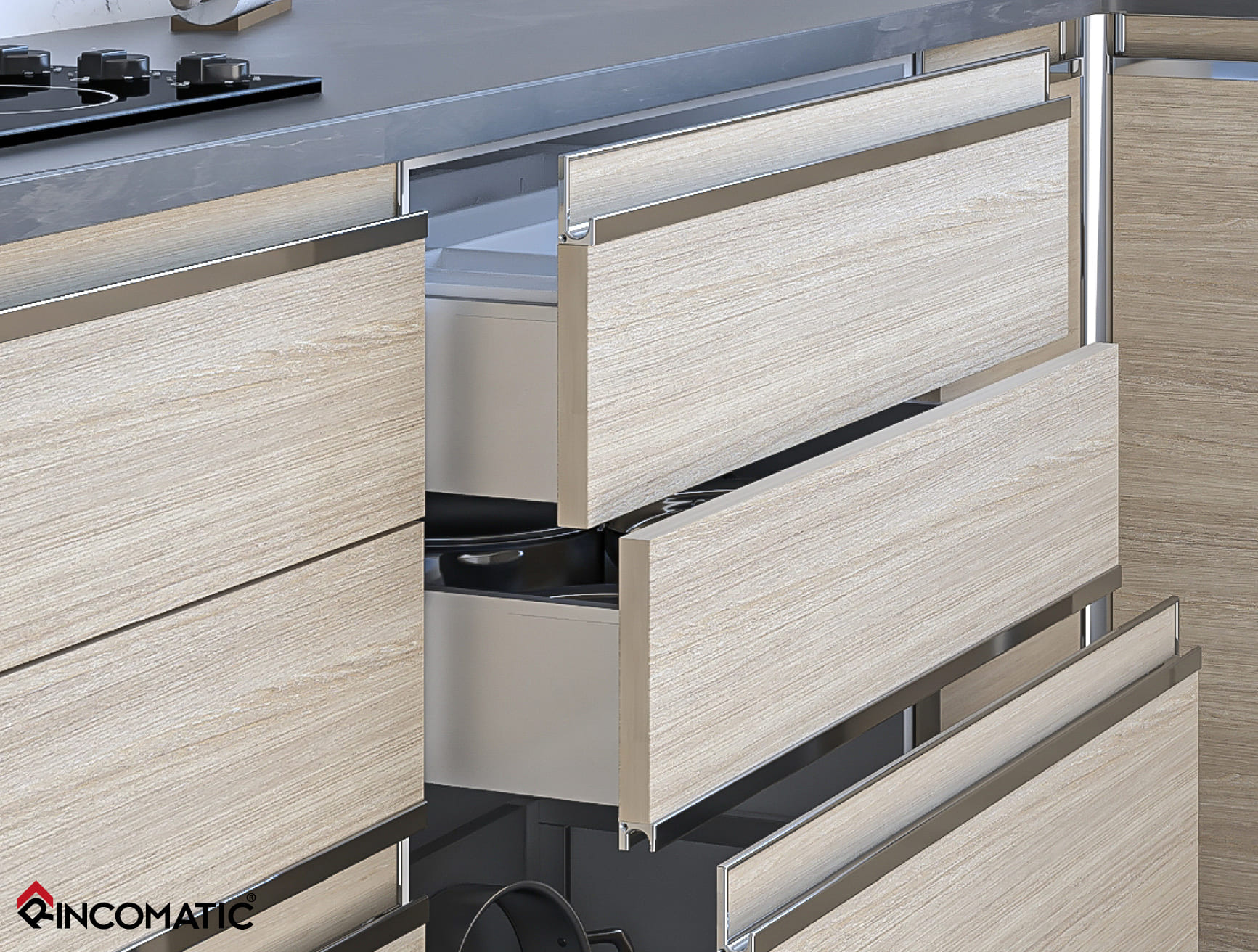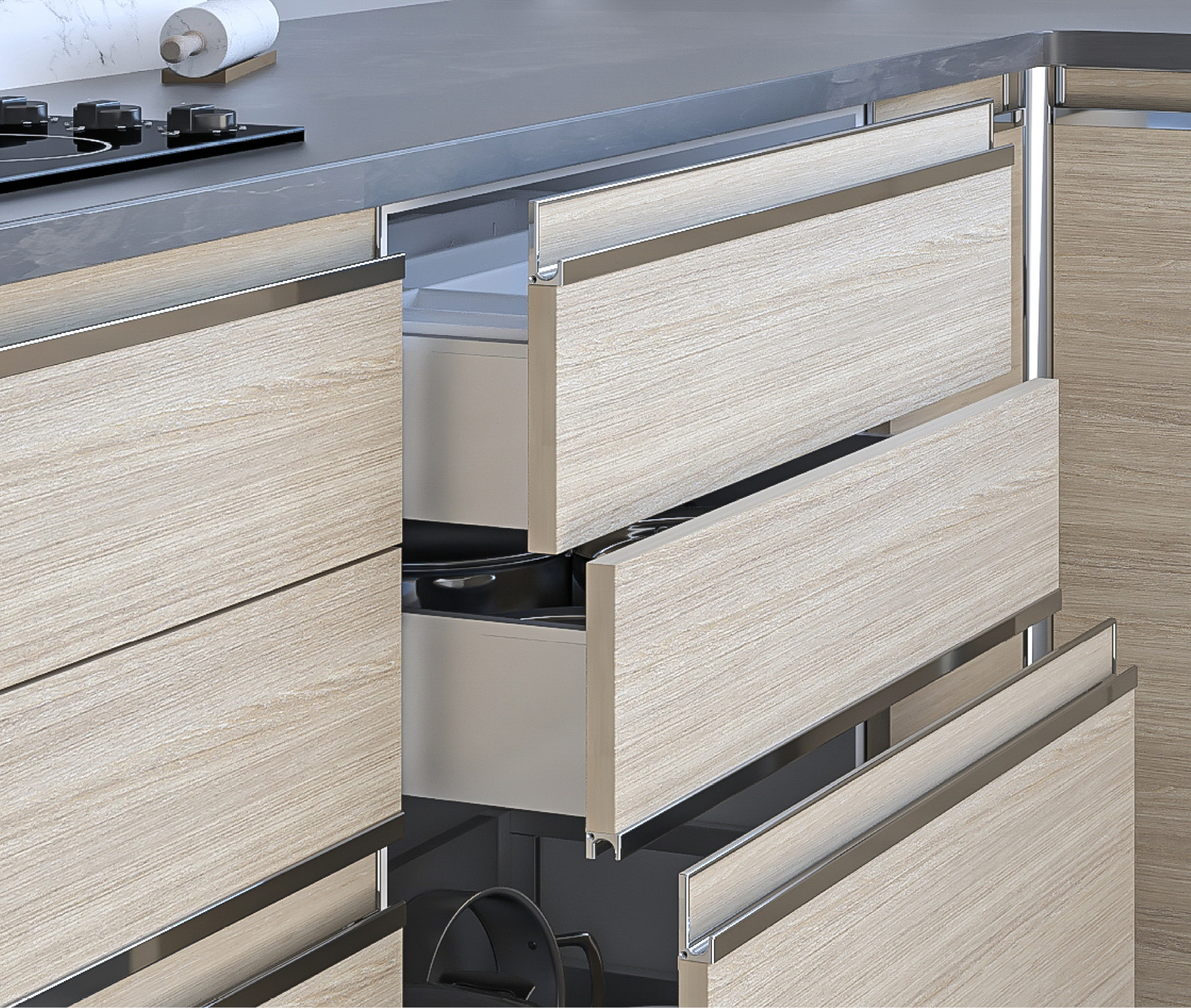 The combination of Syma50 + Syma16 simulates a gola style, allowing for independent opening between the upper and lower fronts. Furthermore, the Syma50 can be customized with a decorative laminate to create a contrast between the handle and the board.