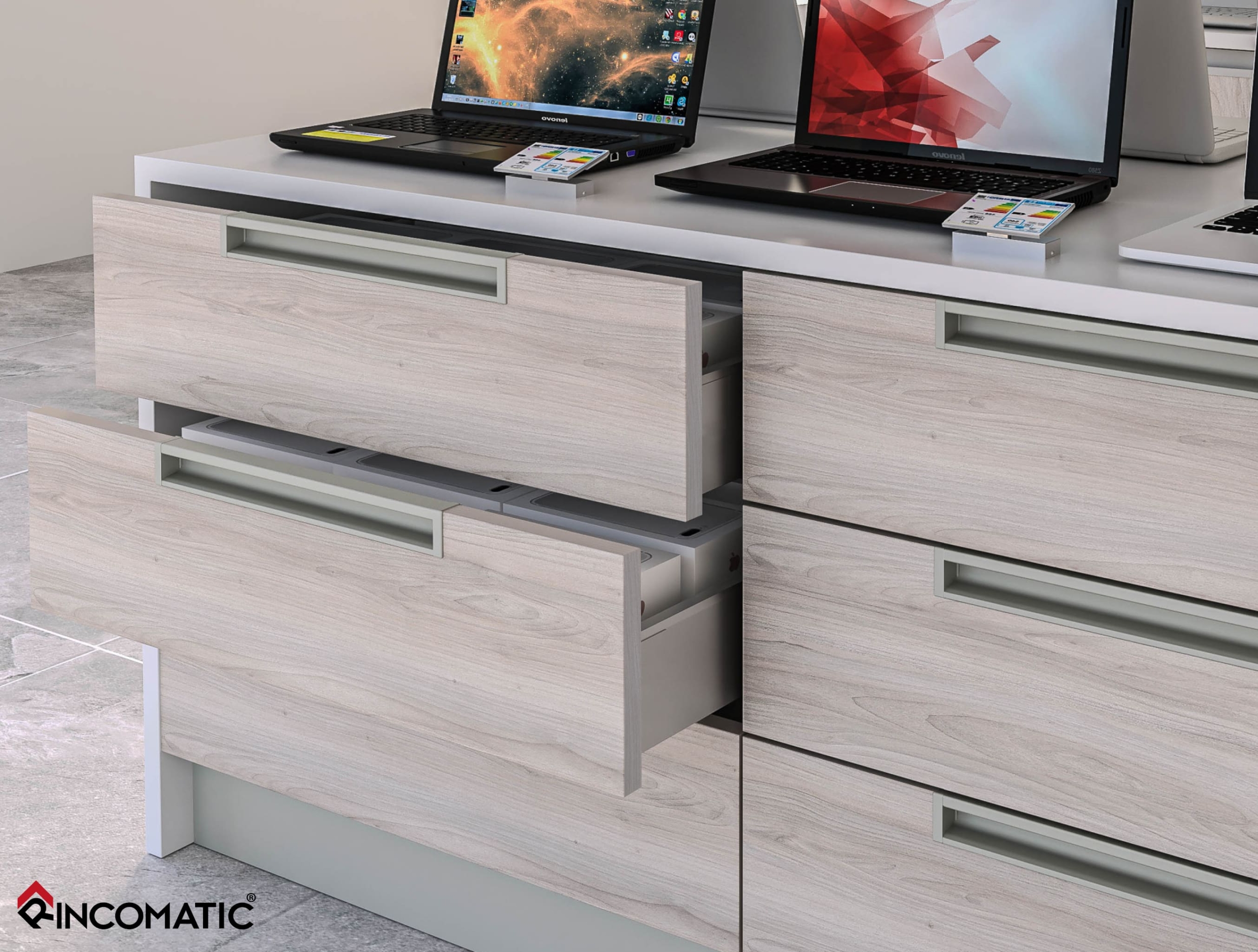 Its installation through Rincomatic Clip-System avoids additional machining of cabinets.