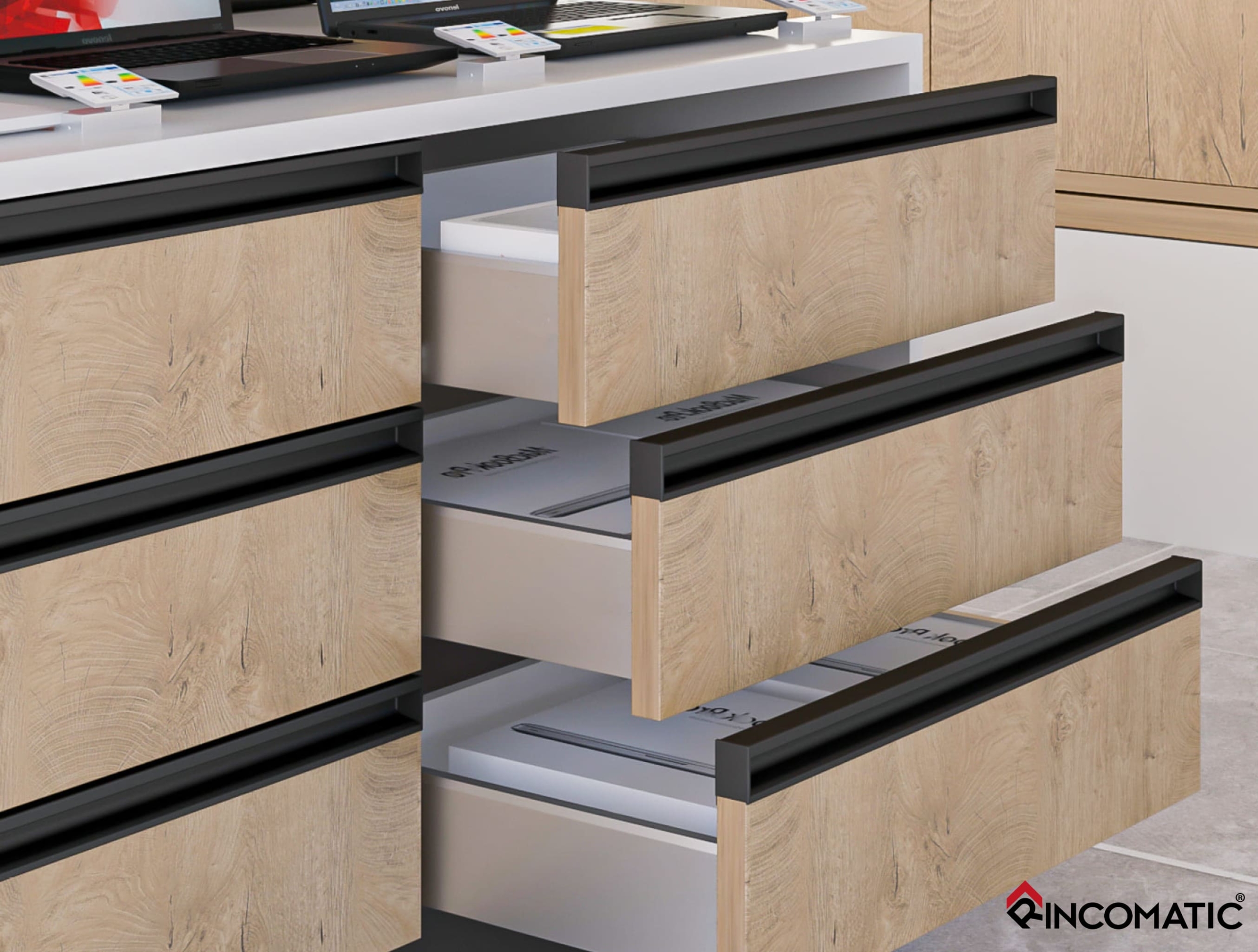 Its installation through Rincomatic Clip-System avoids additional machining of cabinets.
