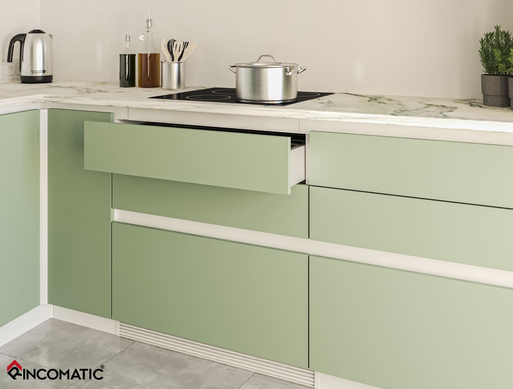 Rincomatic_Ventoo genera una respiración bidireccional en el mueble, permitiendo ubicar un cajón funcional que no se calienta, inmediatamente debajo de la placa de inducción.