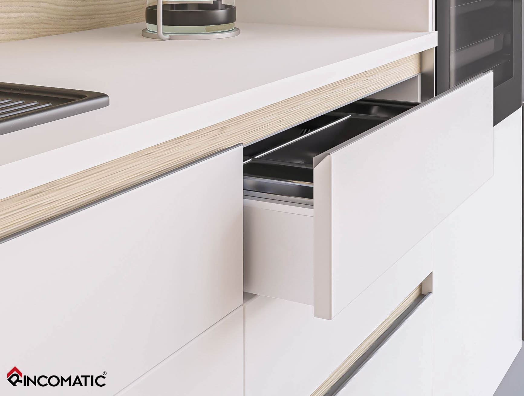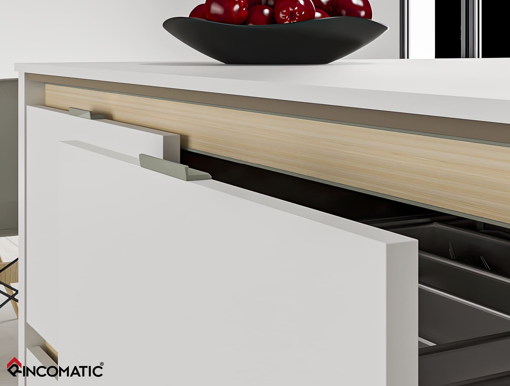 El Perfil Gola Rincomatic para Muebles Altos es un sistema de apertura para puertas de los módulos superiores.