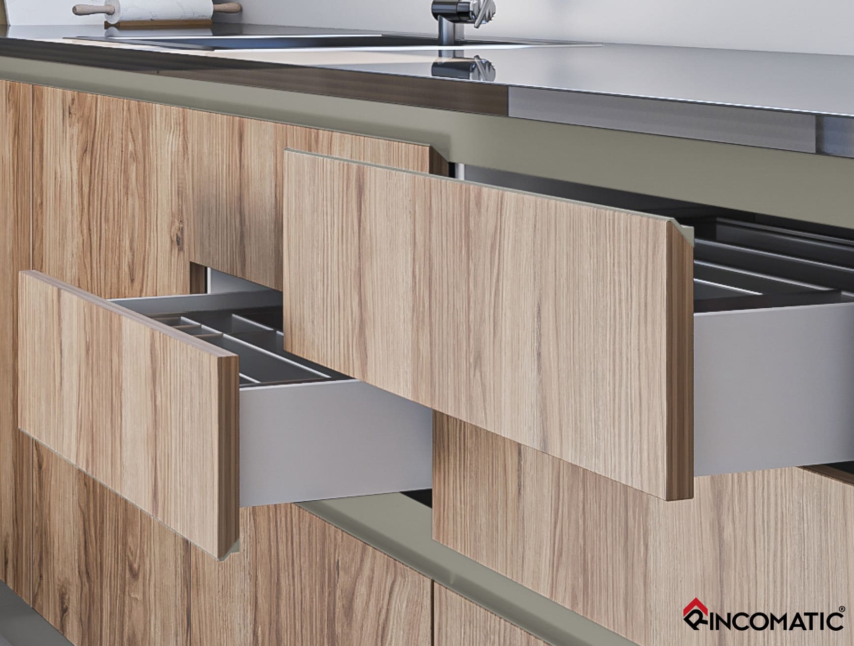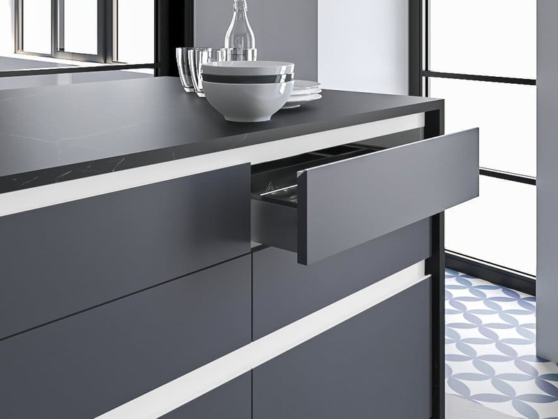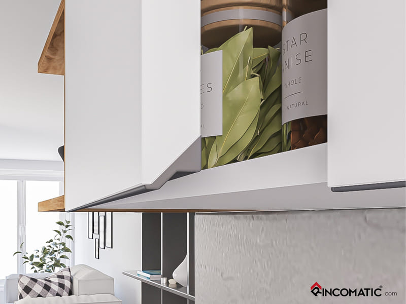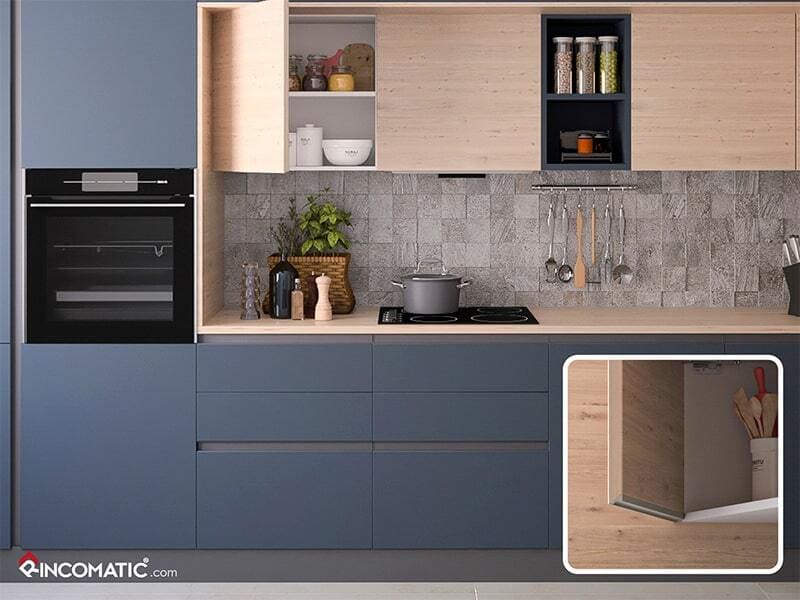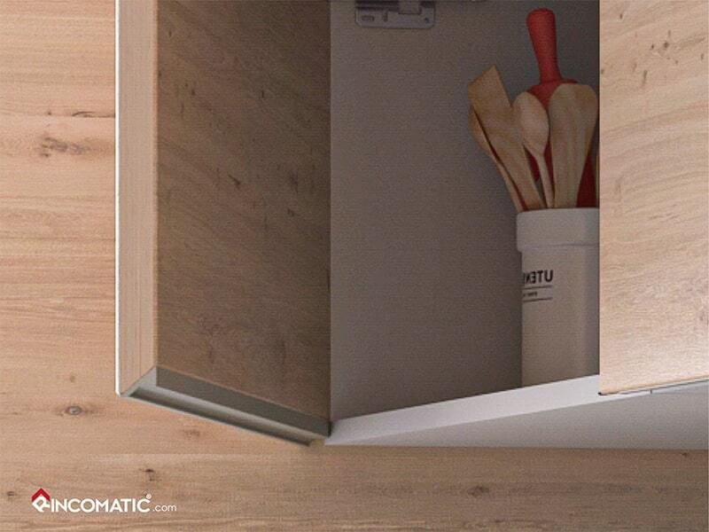 Syma2 Inglete es una alternativa ideal para los muebles altos que proporciona una apertura cómoda, una fácil limpieza evitando el deterioro de la puerta. Puede instalarse en la parte inferior de las puertas superiores y frentes avatibles, manteniendo de este modo lineas paralelas con los muebles bajos.