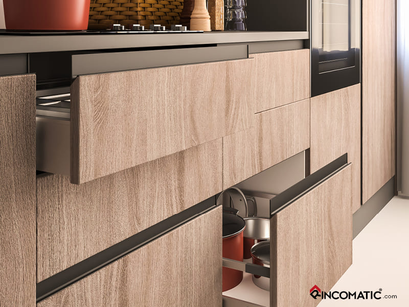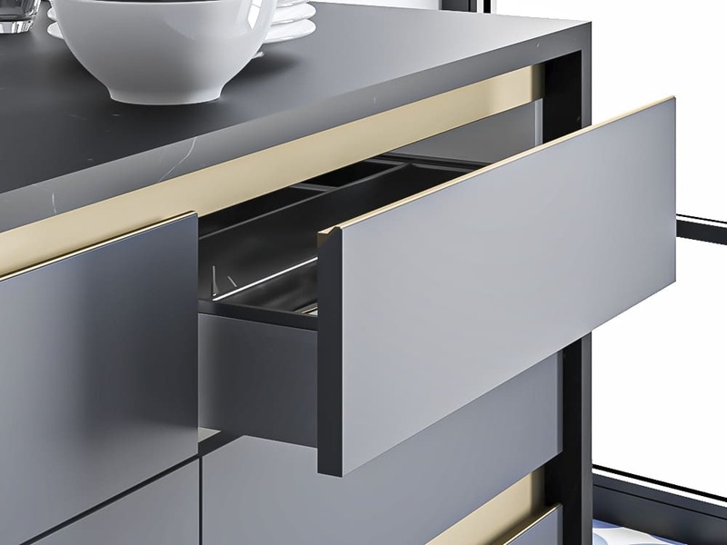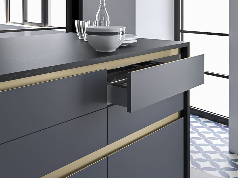 El Tirador Syma2 Inglete junto al Perfil Gola Plano forman una pareja excelente para diseños en línea con las tendencias más actuales. Facilita la apertura de puertas y cajones proporcionando un buen agarre y previene el deterioro del canto superior del frente. Además sus acabados combinan con los perfiles Gola.