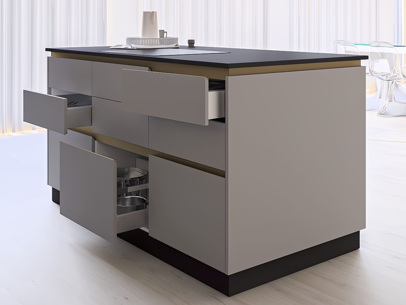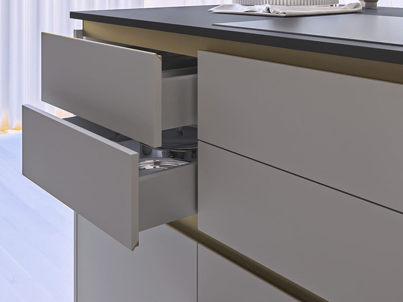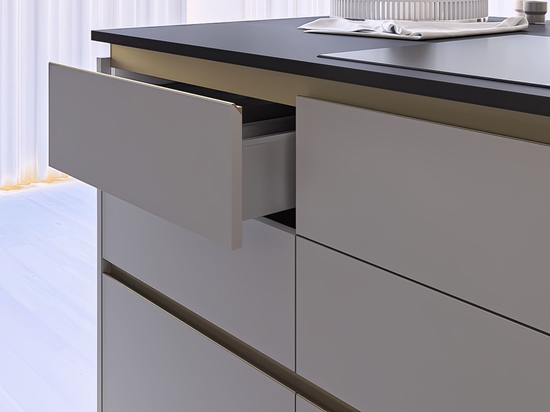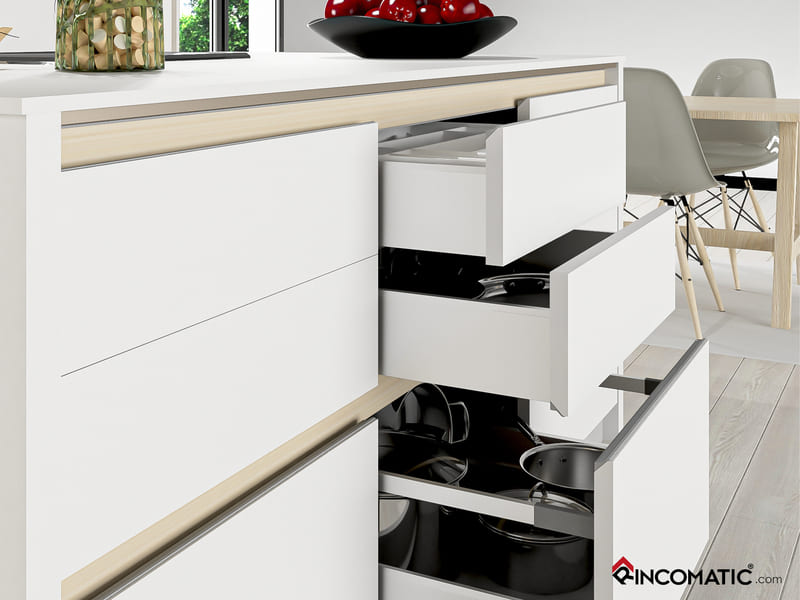 Los tiradores de perfil Syma cuentan con terminales embellecedores que hacen posible cubrir las aristas vivas de aluminio tras el corte de perfiles, proporcionando un tacto suave a los extremos y una fácil limpieza. Se pueden adquir sus componentes por separado o tiradores completamente terminados y listos para su instalación sobre el frente o cajón.