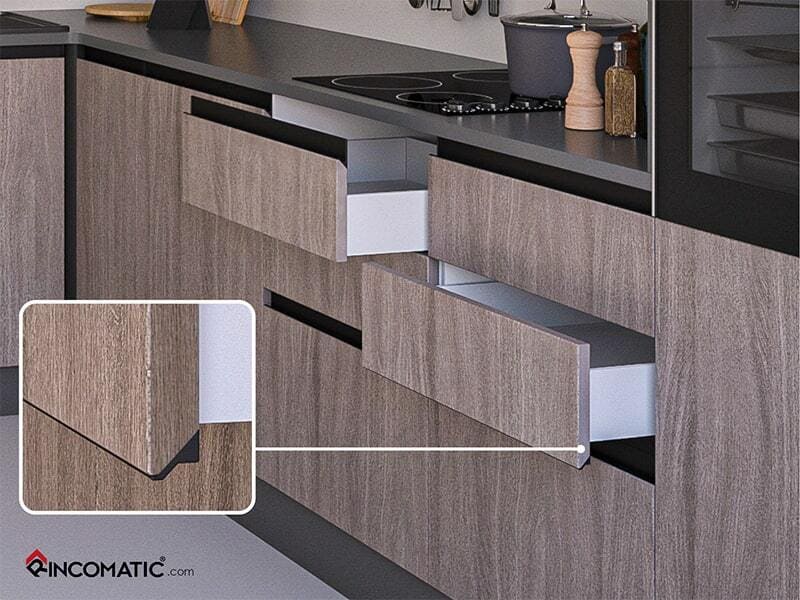 Los tiradores de perfil Syma32 Inglete y Syma2 Inglete pueden ser instalados en puertas o frentes con diferentes grosores. Válido para tablero de diferente espesor.